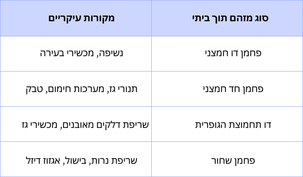 להלן טבלה המציגה מזהמים נפוצים בתוך הבית ומקורותיהם: